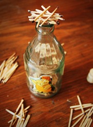 "Storchennest” ist ein Geschicklichkeitsspiel zu dem man einen wachen Geist und vor allem eine ruhige Hand mitbringen sollte. Es gewinnt die Person, die zuerst all ihre Streichhölzer los bekommt. Dies geschieht indem alle Spieler eben dieses Nest aus Streichhölzern auf dem Kopf der Limonadenflasche(!) aufbauen. Die Chancen als Sieger hervorzugehen, wachsen mit dem Alkoholpegel bestimmt nicht – nur vielleicht der Spaß. Ob die Macherin dieses Nachbaus von 1976 sich zum Spielen auch einen genehmigt hatte wissen wir nicht. In jedem Fall sagen wir herzlichen Dank und zum Wohl!