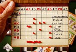 “Mein erstes Gesellschaftsspiel war komplett aus Plaste. Wir hatten das Kühlmöbelwerk in Erfurt als sogenannten Patenbetrieb. ESP hieß das — Einführung in die sozialistische Produktion. Einmal in der Woche sind wir mit unseren Schülern in diesen Betrieb gegangen und durften da mitproduzieren. Der Betrieb verarbeitete PVC, eben Kunststoff, und dadurch bin ich recht einfach an diesen Werkstoff herangekommen. Nach der Wende ist dieser Patenbetrieb aufgelöst worden. Dann wurden die ganzen PVC Platten an Schulen abgegeben und ich habe sie regelrecht gehamstert, so dass mir immer noch reichlich Material zur Verfügung steht. PVC hatte zu DDR Zeiten noch einen etwas anderen Stellenwert als heute. Ich konnte es leicht mit der Hebelschere zerschneiden und so zum Beispiel viele der benötigten Spielsteine herstellen. Das war zwar ziemlich aufwändig, hatte aber ein erfreuliches Ergebnis. So entstand unter anderem mein nachgemachtes Spiel Detektiv, bei dem ich als Vorlage Cluedo hatte, eins meiner Lieblingsspiele. Ansonsten war und ist mein Hauptmaterial Sperrholz. Das musste man auch immer hamstern. Mein Vater hat mal in einem Kolonialwarengeschäft gearbeitet und dort benutzte man Teekisten. Wenn sie zerlegt wurden, kam man gut an Sperrholz heran und konnte es dann verarbeiten. Also, Materialien zu bekommen war in der DDR immer ganz problematisch. Da musste man schnell zugreifen, wenn es mal was gab. Oftmals war das auch sogenannte Bückware, also das, was unter dem Ladentisch lag, nicht für jedermann sichtbar.”
